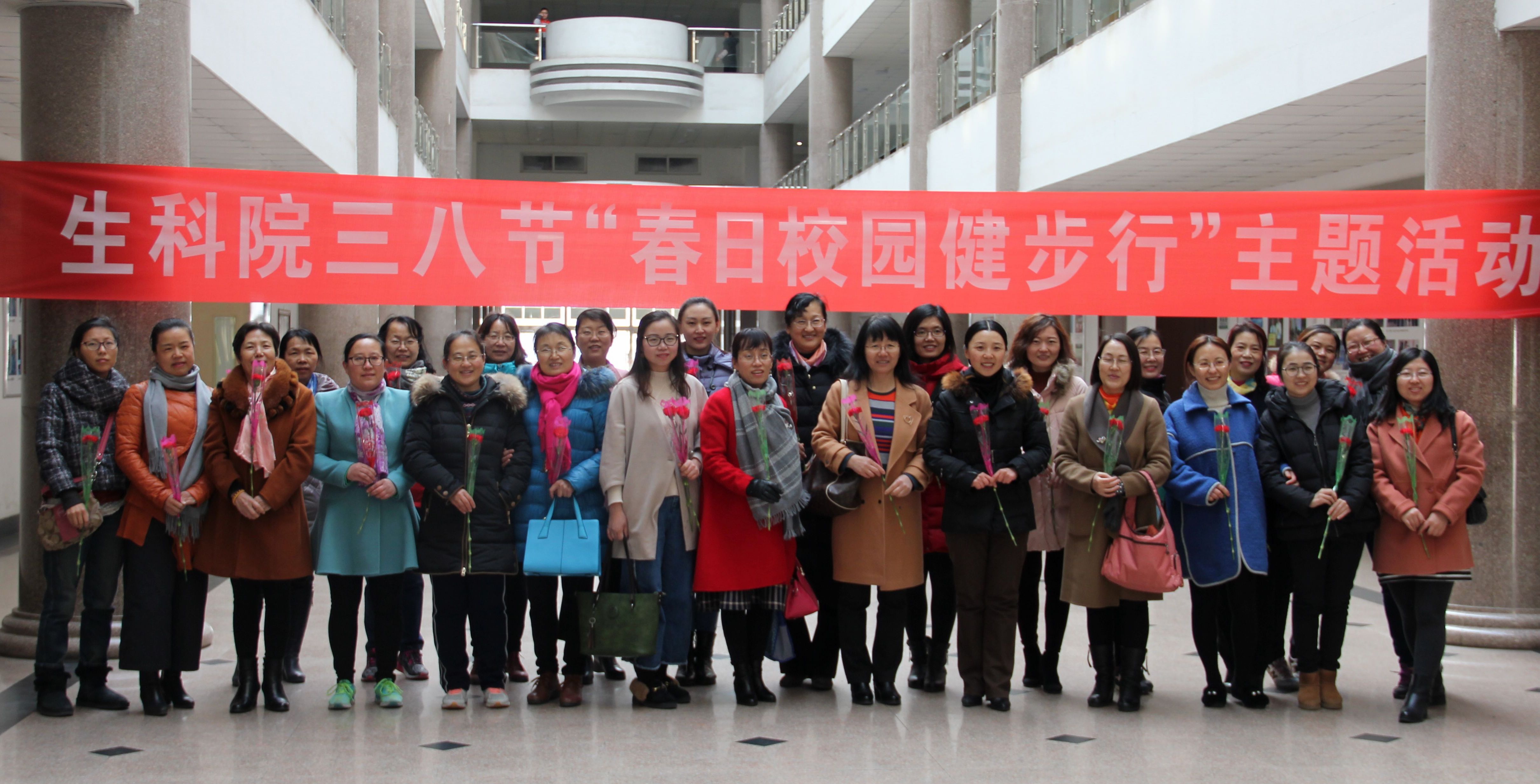 为了丰富广大女教职工业余文化生活,活跃校园文化氛围,展示我院女教工的风采,让全体女教工过一个温馨、难忘而有意义的节日,我院于3月8日组织全体女教工在生物楼一楼大厅举行了“生科快乐三八节,春日校园健步行”主题活动,学院四十余名女教工参加了本次活动。