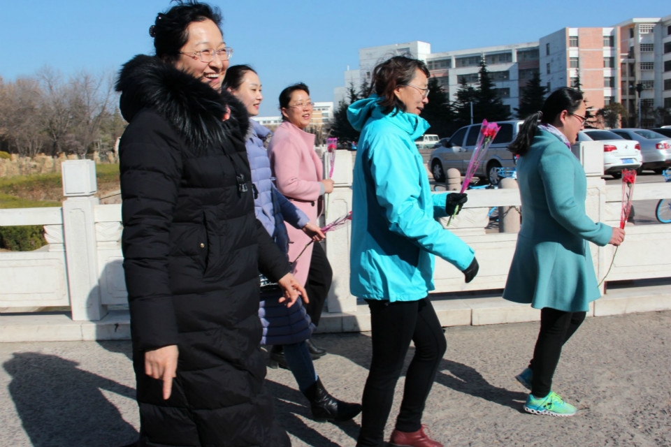 我院女教工总人数占到全院教工比例的一半以上,在工会组织的积极组织和带领下,全体女教工齐聚一堂,男教工代表为女教工送上鲜艳的康乃馨及小礼物表示节日的祝福,康乃馨的花语是永远健康、永远年轻、永远美丽,一朵朵美丽的鲜花映照着老师们甜蜜的笑容,幸福溢于言表,整个活动现场沉浸在温馨欢乐的氛围之中。接下来由院长刘新为本次活动致辞,她高度赞扬了我院女教工巾帼不让须眉的敬业精神和拼搏精神,为全体女教工送上了亲切慰问和节日祝福并主持了出发仪式。随后本次庆三八春日校园健步行活动正式开始,数十名女教工从主楼前广场出发,途经学术会馆、润兴餐厅和文体馆等处返回至主楼前广场,经过近一个小时的努力,全体女教工走完全程成功抵达终点,虽然步行行程较远,但大家步伐矫健,精神焕发,一路上不时发出欢声笑语,每一个人脸上洋溢着我运动我快乐的开心和喜悦。
