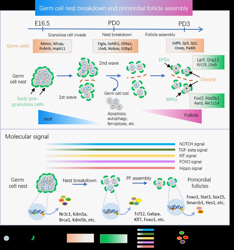 图:原始卵泡形成过程的基因表达动态变化和分子调控网络