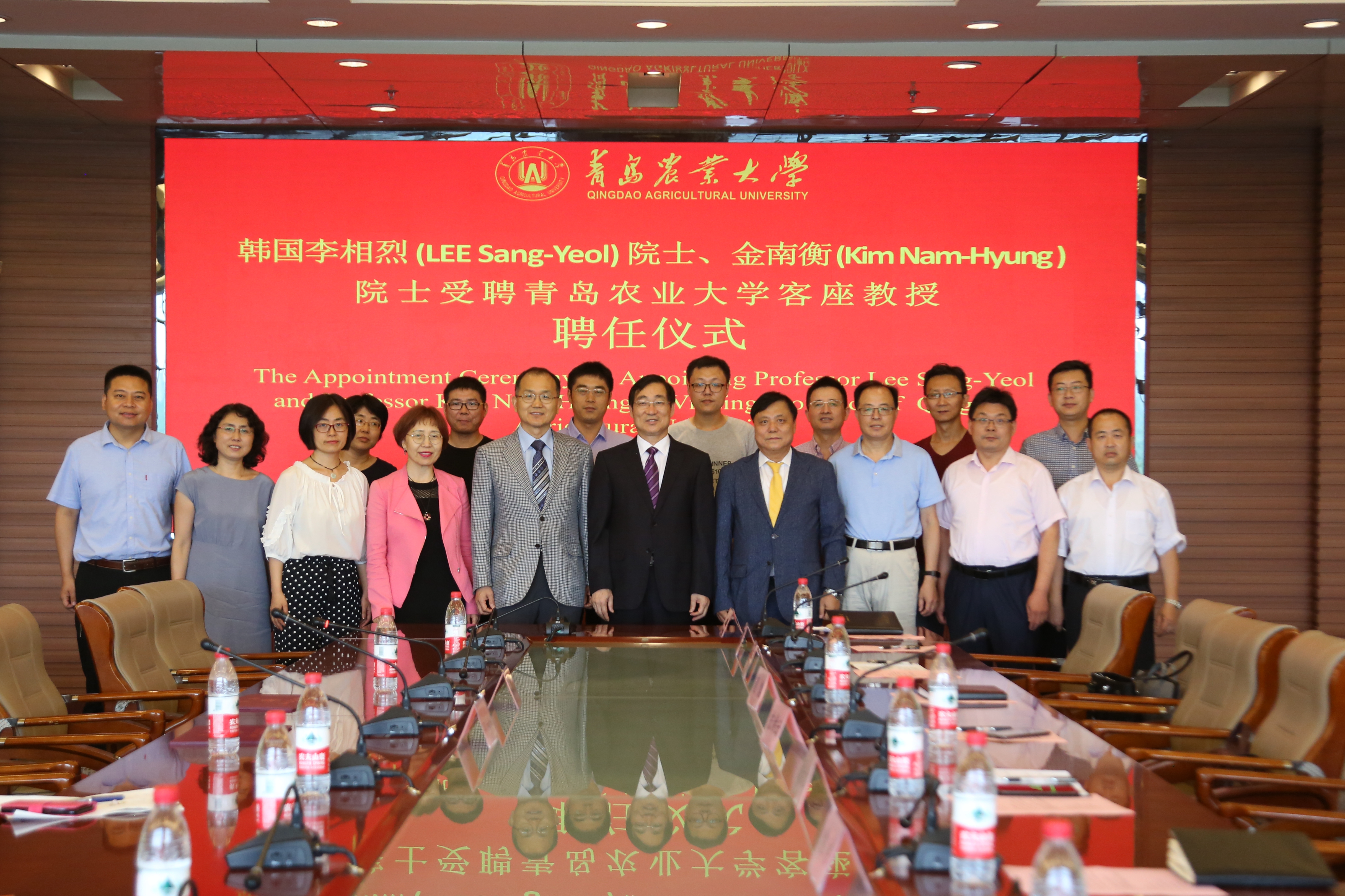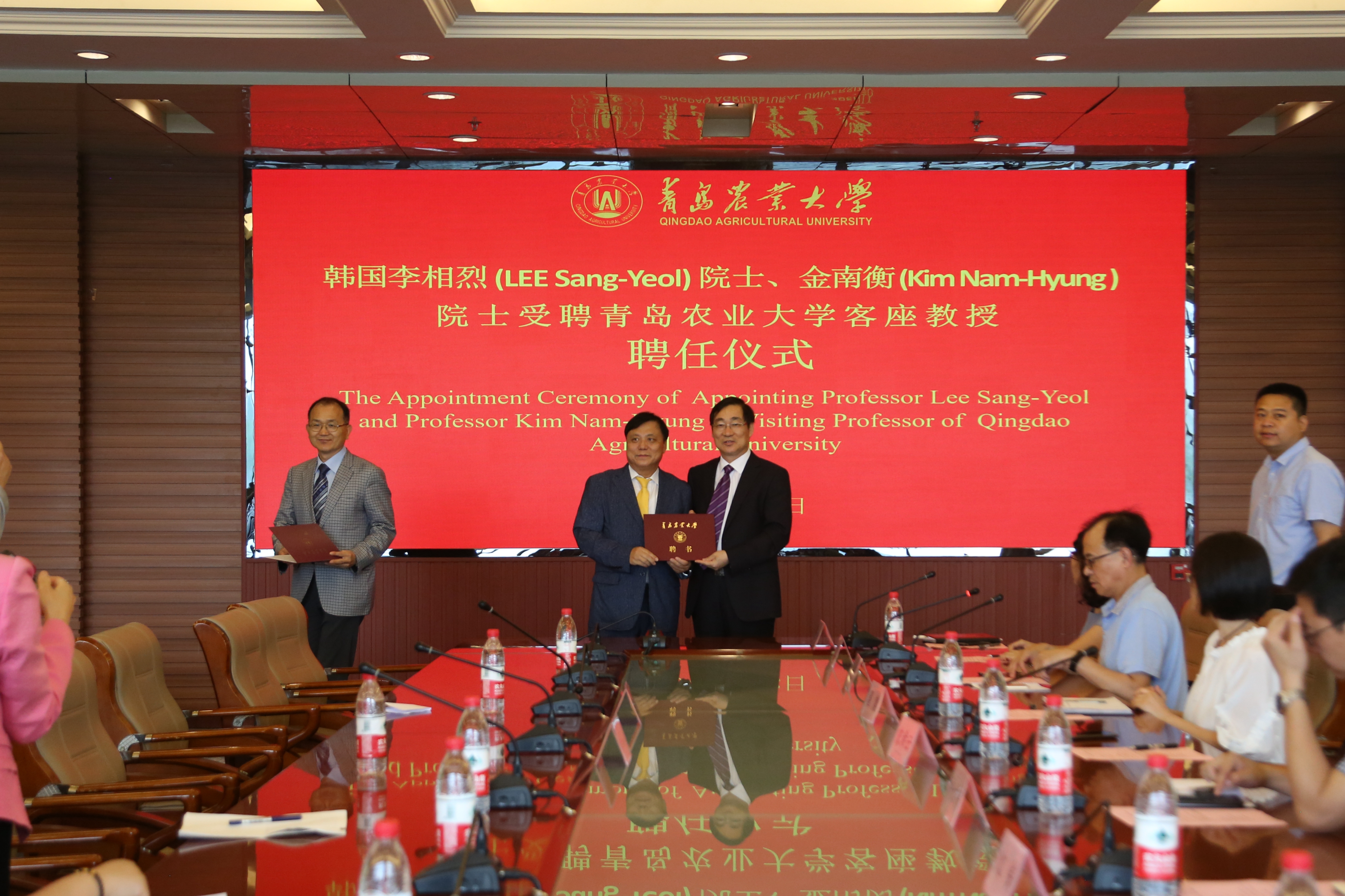 7月8日下午,青岛农业大学举行聘任仪式,聘任韩国科学技术翰林院院士、庆尚大学李相烈教授,韩国科学技术翰林院院士、忠北大学金南衡院士为我校客座教授。校长宋希云出席聘任仪式并为两位院士颁发聘书,聘任仪式由生命科学学院党委书记孙世孟教授主持。