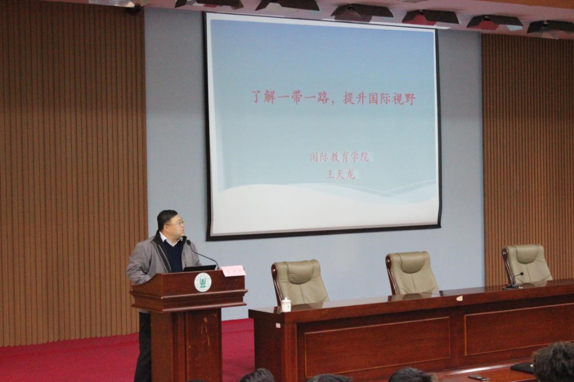 王天龙老师以“了解‘一带一路’,提升国际视野”为题,从五个方向,详细介绍了“一带一路”的地理含义、“一带一路”倡议的重大意义、“一带一路”倡议的丰富内涵、“一带一路”建设造福沿线各国人民、拓展“一带一路”国际合作新空间五个方面内容。他强调“一带一路”战略是把我们的“中国方案”分享给沿线各国人民,带动共同发展,实现人类共同富裕。“一带一路”建设的实施,将为我国实现两个一百年的奋斗目标和中华民族伟大复兴中国梦奠定重要基础。王天龙还从身边留学生同学举例,告诉同学们要握时代大势,拓展自己的国际视野,提升国际理解能力。