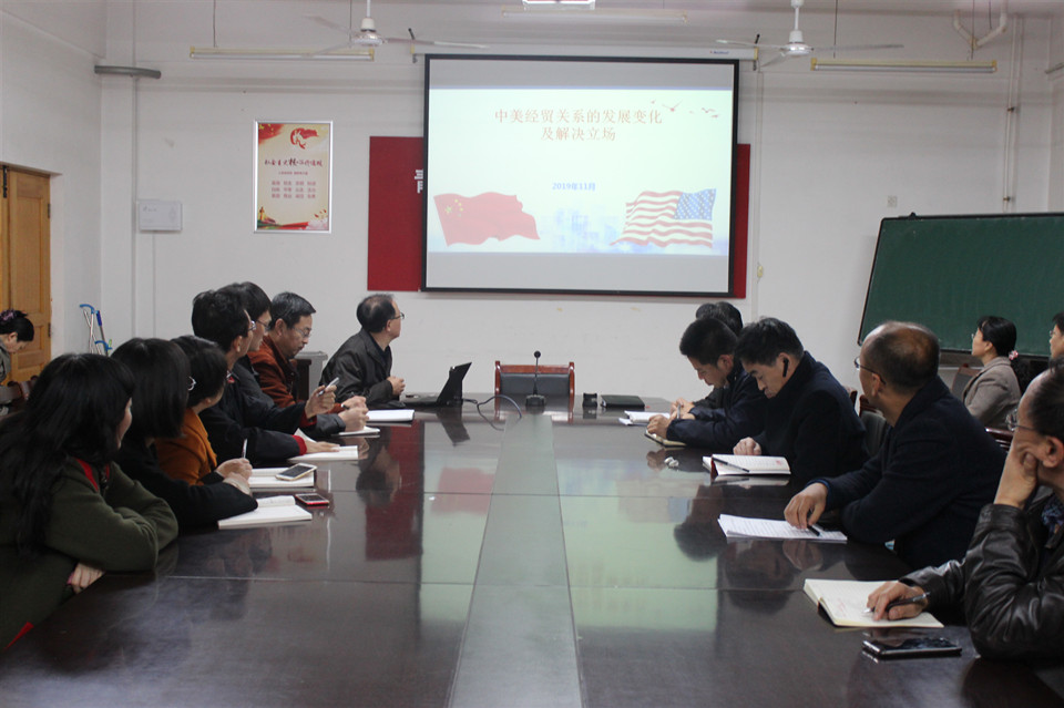 11月14日,我院举行“中美经贸关系的发展变化及解决立场”专题党课,学院党委书记孙世孟主讲,学院全体教职工参加