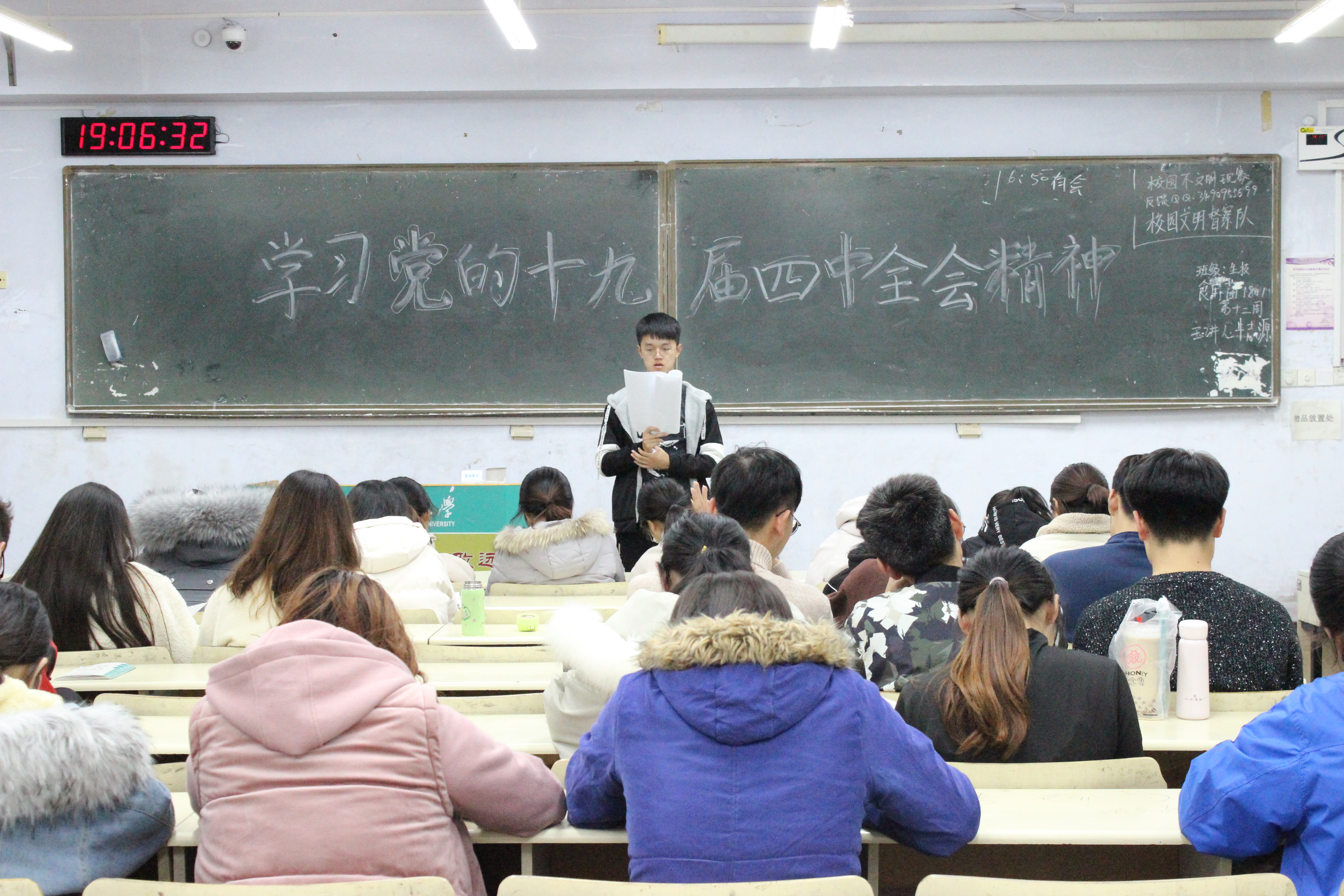 11月24日,学院在教学区举行“党的十九届四中全会精神专题学习”主题团课。18、19级全体同学参加团课。