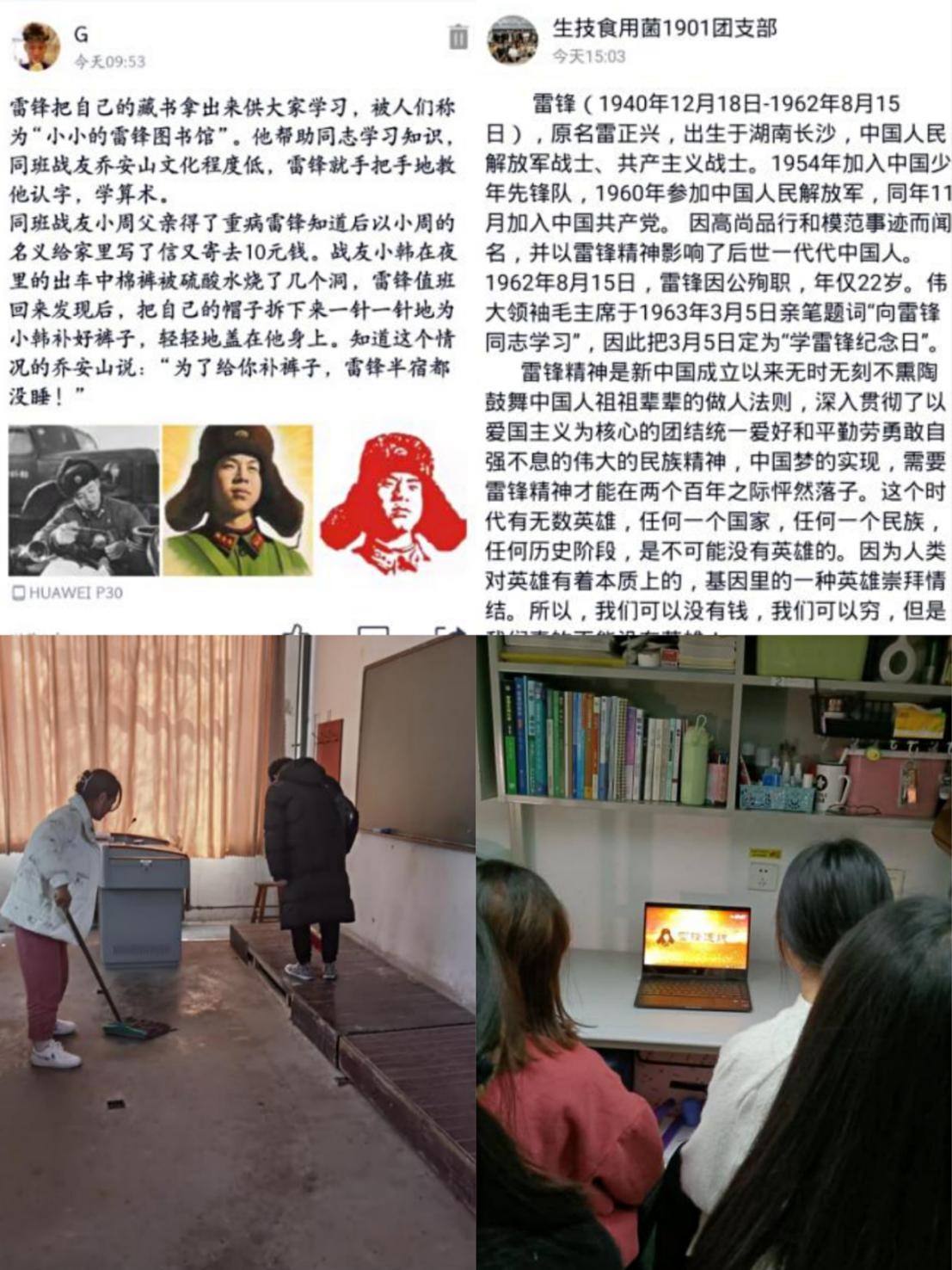 活动期间,学院开展了“传播网络正能量、争做文明好网民”、“雷锋信箱”、“志愿服务”等系列活动,广大青年学生从“我为身边的人做件事”着手,积极开展志愿行动。3月4日,学院各团支部组织开展了以“学习雷锋事迹,传承志愿精神”为主题的团日活动,通过学习强国平台组织团员观看雷锋事迹纪录片,学习雷锋精神。3月5日,学院学生党员、入党积极分子开展志愿服务活动,自发组成志愿团队,分组对教室进行卫生清扫,充分发挥了学生党员的先锋模范作用,展现了生科学子的良好风貌,以实际行动带头践行雷锋精神。学院学生积极通过QQ空间、微信朋友圈等网络媒体转发雷锋事迹、宣传雷锋精神,记录自己的故事和体会,与他人共同分享感悟与体会。