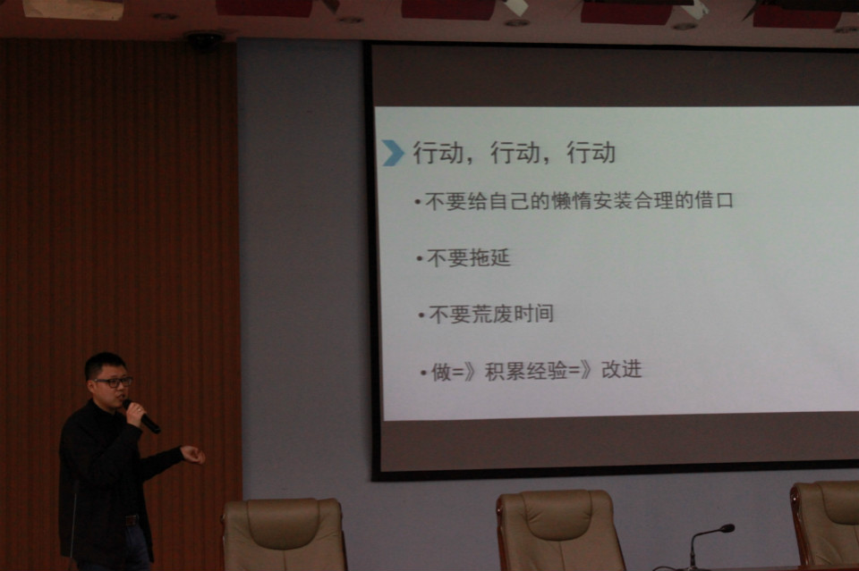 最后,初文杰对这次讲坛做出总结,鼓励同学们把握好自己的青春,以热情饱满的状态积极学习来度过一个令自己骄傲和自豪的大学生活。