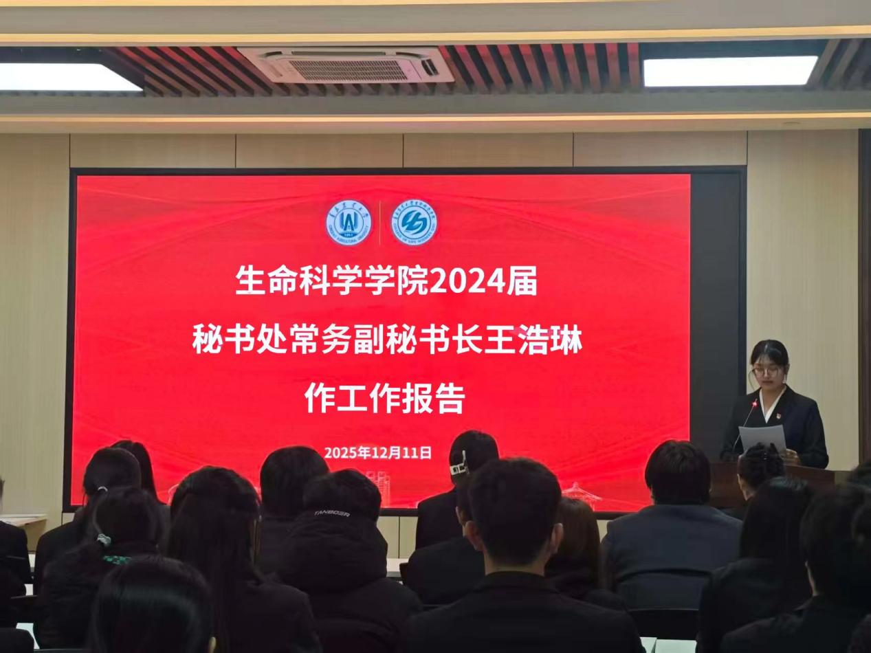 12月11日,青岛农业大学生命科学学院第四次学生代表大会于生物楼C312顺利召开。学院党委副书记、副院长刘妍玲,团委书记王洋出席会议并发表致辞,学院第三届学生会秘书处常务副秘书长王浩琳作工作报告。会议由学院学生会主席团成员任照芳主持。