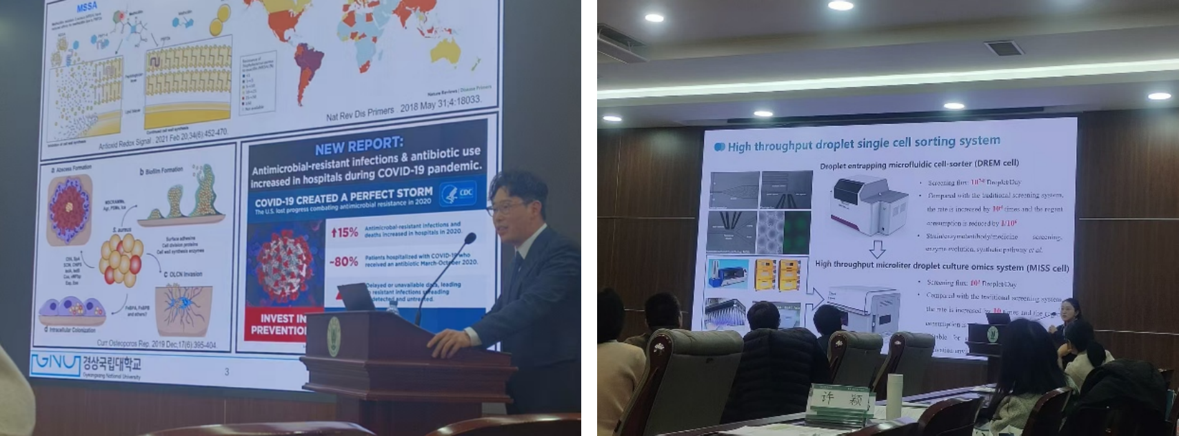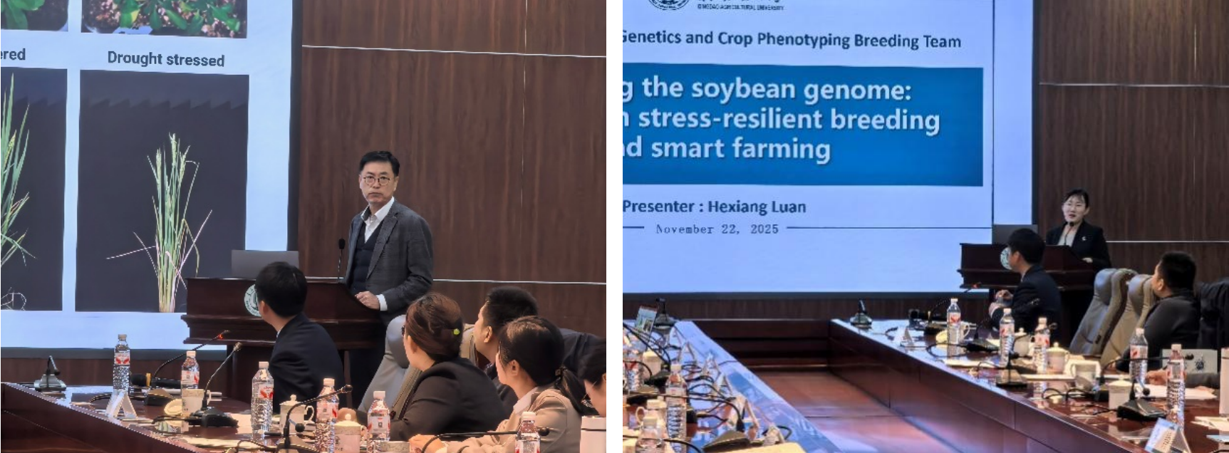 郭尚敬副校长和Woo Sik Chung所长分别为开幕式致辞。郭尚敬在致辞中向远道而来的庆尚大学各位专家表示热烈欢迎,向长期以来致力于两校合作的各位同仁致以最诚挚的感谢。他表示生物育种和生物技术是当今世界科技发展的前沿领域,是破解全球粮食安全、生态保护、产业升级等重大挑战的核心力量。本次学术论坛的顺利召开,是两校在生物育种和生物技术领域交流合作的重要里程碑,双方不仅在科研上协同攻关,更在人才培养、师资交流等方面探索新模式、开辟新路径。希望更多的青年师生参与其中,在交流中增长见识、提升能力,让学术交流的桥梁更加坚固,让合作的成果惠及更多的师生。