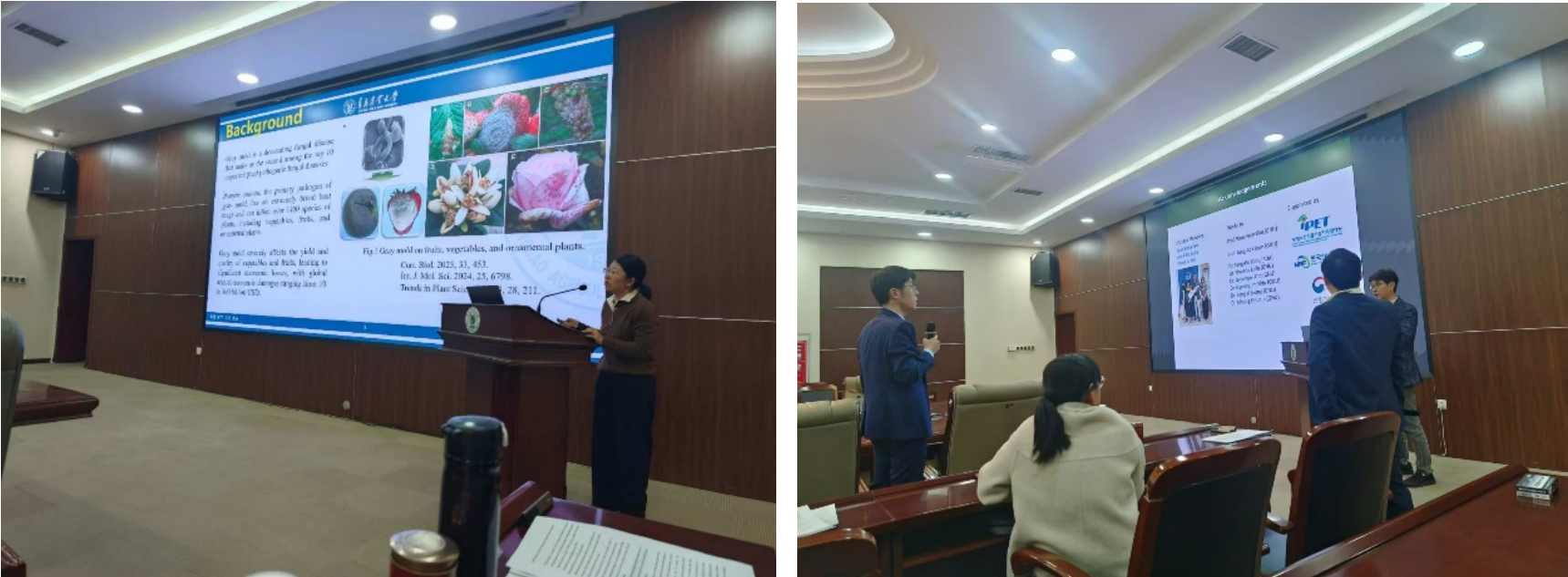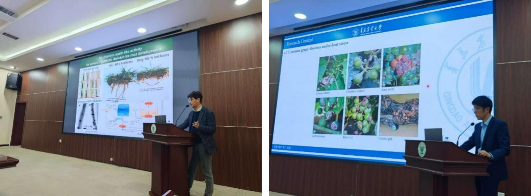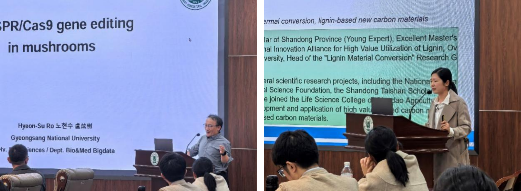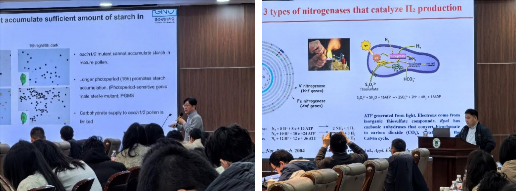在学术交流环节,来自庆尚大学的Woo Sik Chung、Sang-Kyu Lee、Hyeon-Su Ro、Joon Yung Cha、Hyuk Kwon Kwon、Daewon Kim等教授,以及青岛农业大学的张玉喜、尹令红、杜娟、栾鹤翔、王兆宝、刘广超、蔡蓉凤等专家学者相继作了精彩的学术报告。与会专家学者和广大师生围绕生物育种与生物技术领域的前沿动态和最新研究成果展开了深入且富有成效的研讨与交流。