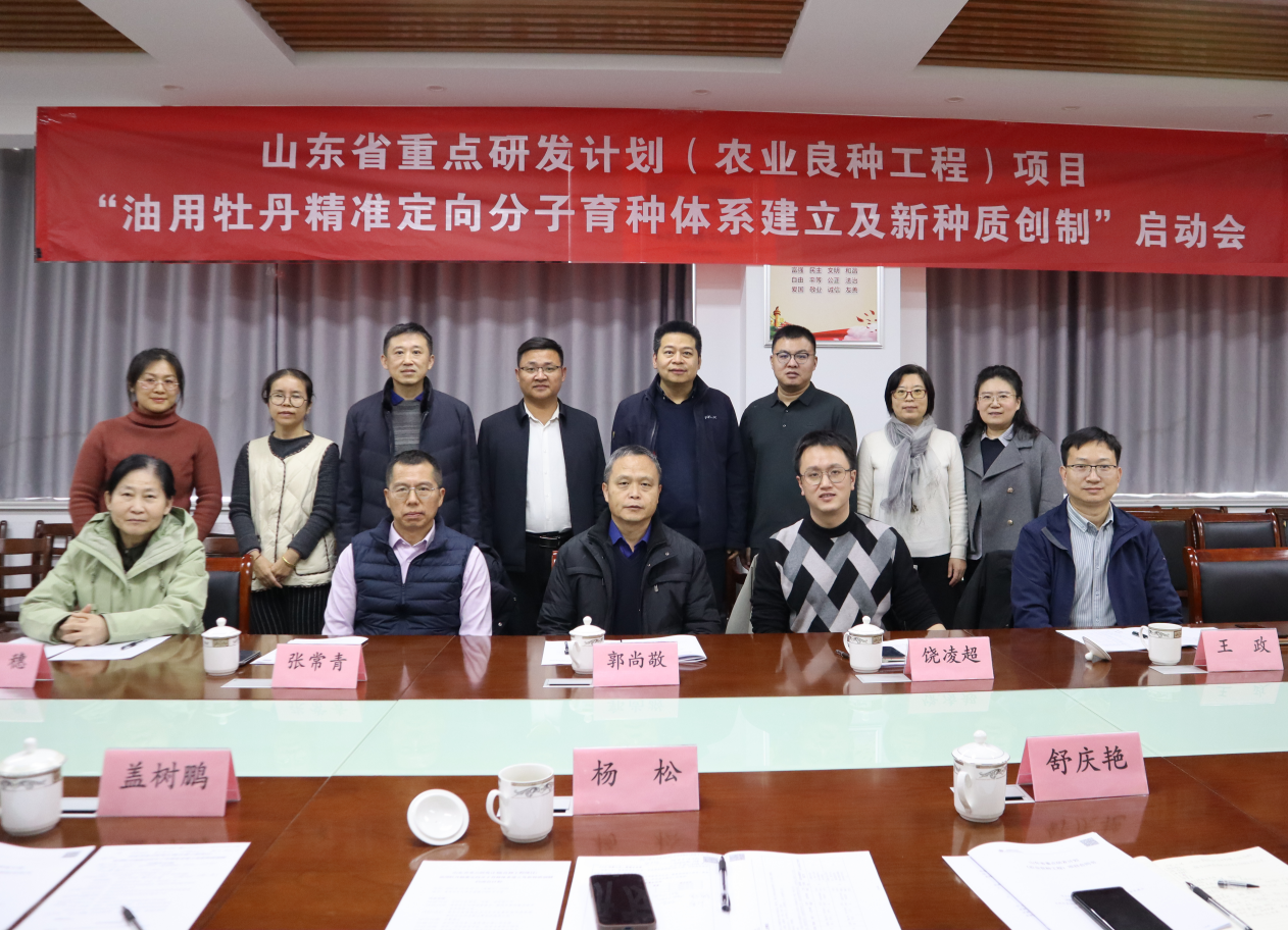 2025年12月26日,山东省重点研发计划(农业良种工程)项目“油用牡丹精准定向分子育种体系建立及新种质创制”(2025LZGC050)启动会在青岛农业大学成功召开。青岛农业大学党委委员、副校长郭尚敬,青岛市科技局农业与社会发展科技处副处长饶凌超,青岛农业大学生命科学学院院长杨松教授,特邀专家中国农业大学园艺学院副院长张常青教授、河南农业大学人事处副处长王政教授,审计专家济南穗智联合会计师事务所首席合伙人王穗,以及项目牵头单位青岛农业大学、合作单位中国科学院植物研究所、山东省林业科学研究院、中科农林科技有限公司的核心成员共同出席会议,正式启动项目。