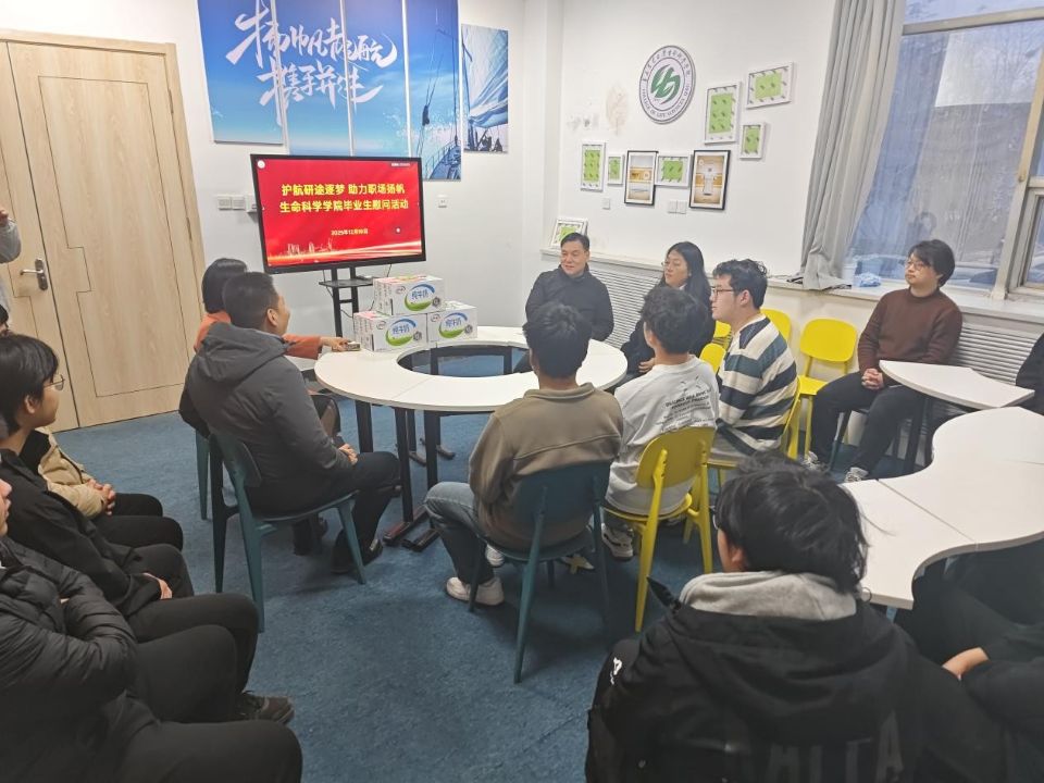 在2026届毕业生备战研究生招生考试、求职冲刺的关键时期,为表达学院对毕业生的关心与支持,12月10日,生命科学学院党委书记孙景福,院长杨松,党委副书记、副院长刘妍玲,团委书记王洋一同走进学生宿舍,亲切看望毕业生,为大家送上鼓励与祝福,并在东苑四号楼“一站式”学生社区组织开展毕业生慰问活动。