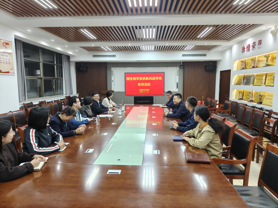 为深入贯彻落实学校关于“抓教风、促学风”专项行动要求,微生物系于2025年5月开始组织开展专项行动,通过系统化部署、精准化落实,各项工作有序推进,教风学风建设取得了阶段性成效。2025年11月15日,微生物学系在学院资料室召开“抓教风、促学风”专项行动总结会,系主任王光远主持会议,杨松院长列席会议并进行性了指导。